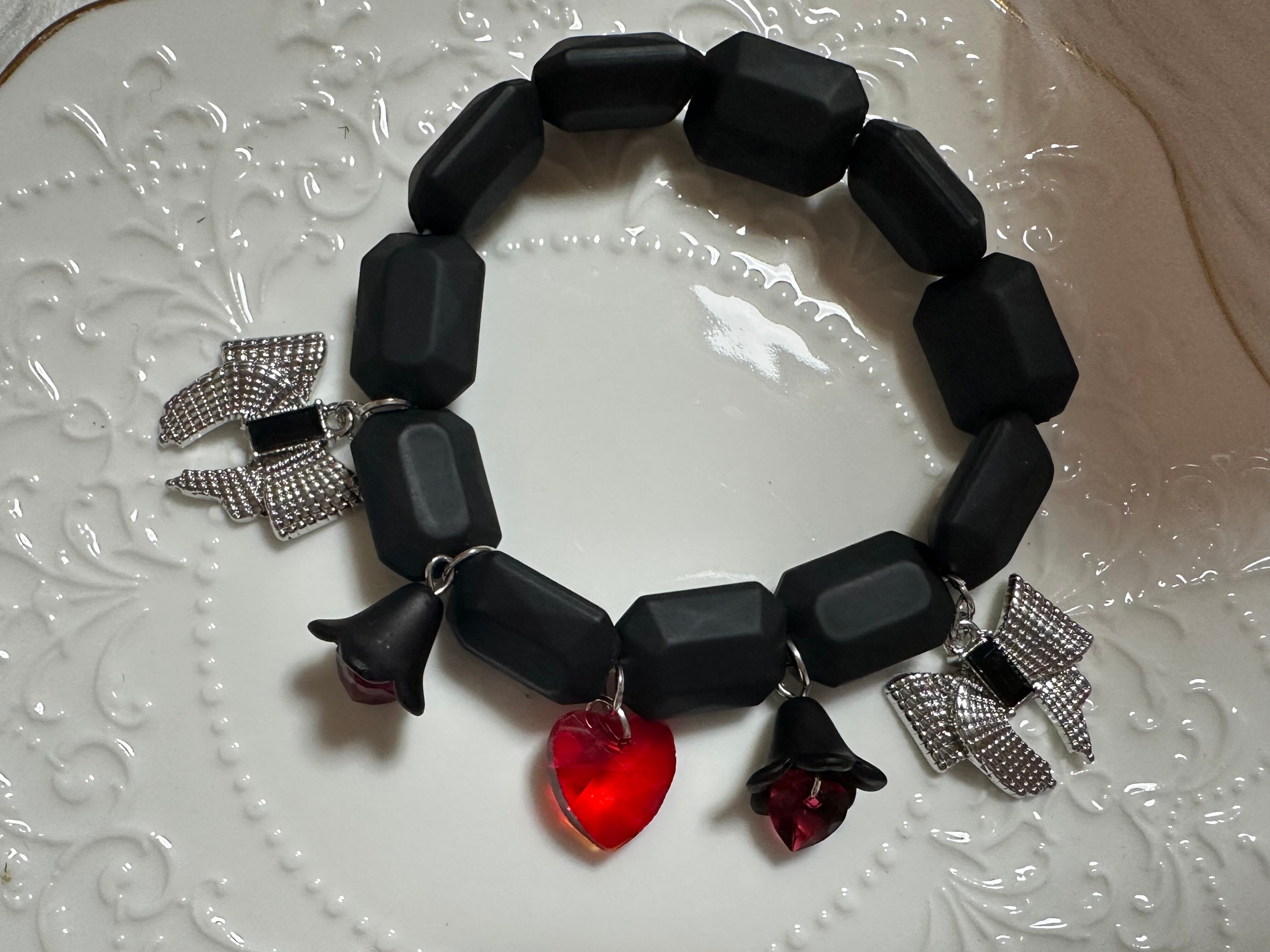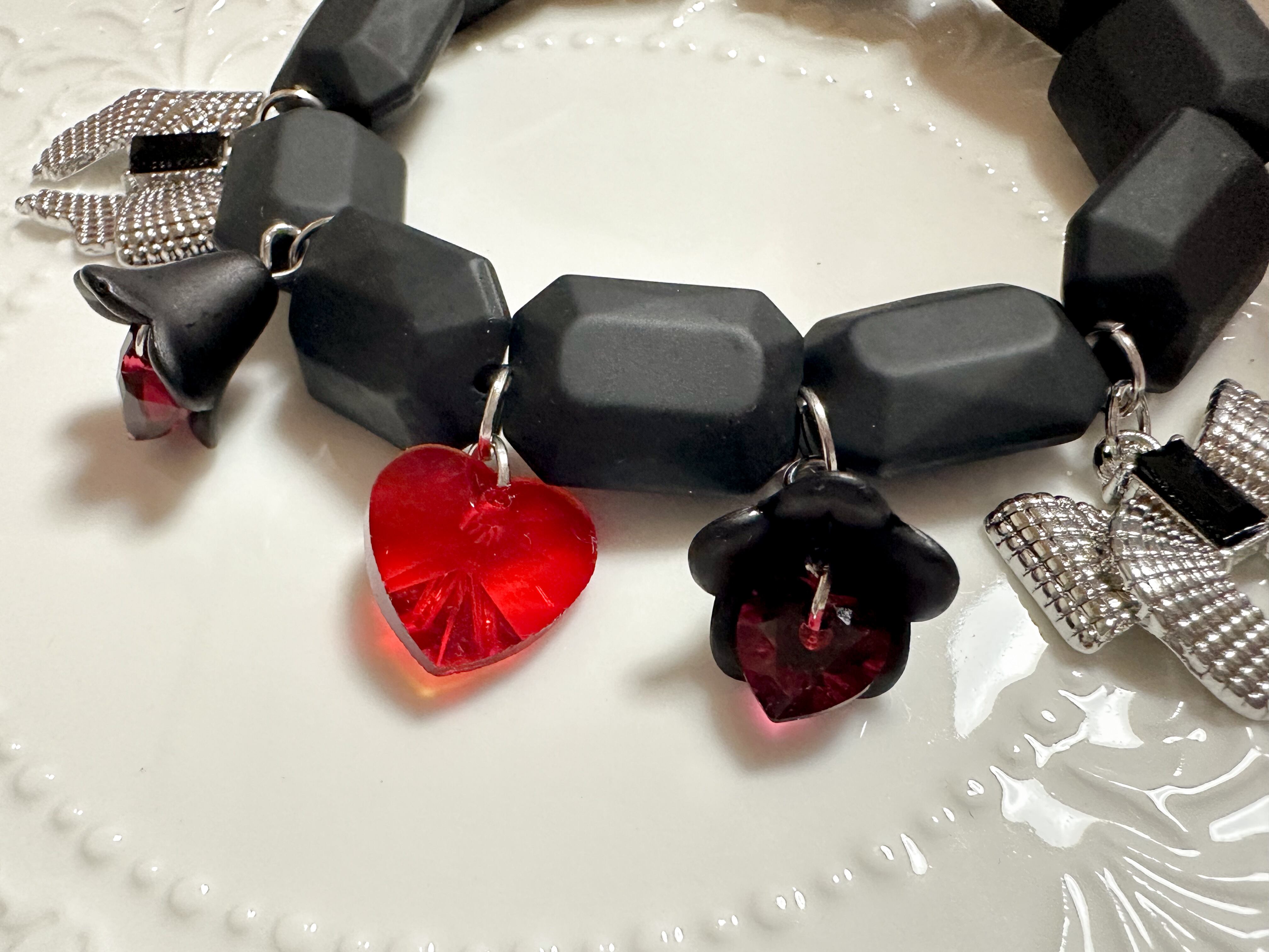 赤のガラスハート、シルバーのリボン、