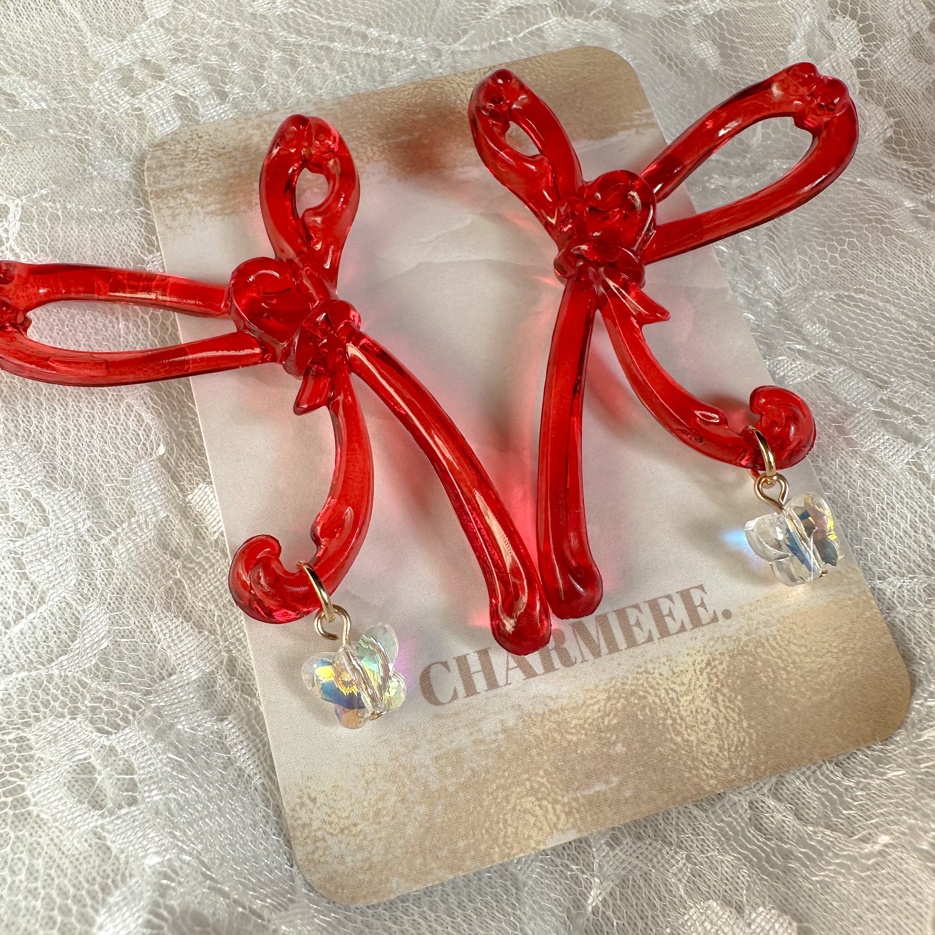 大きなクリアリボンにガラスの蝶がゆれる耳飾り。